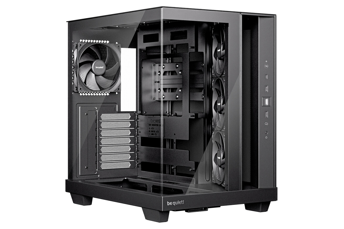 Az RGB nélküli megközelítéssel a Light Base 500 diszkrét és stílusos megjelenést kínál, ami bármilyen környezethez illeszkedik, kezdve a gamer asztaltól egészen a kreatív stúdiókig. Teljesítménycentrikus, négy előtelepített, 120 mm-es Pure Wings 3 PWM-ventilátort tartalmaz: az optimális légáramlásért és a látványért három fordított lapátos kialakításút oldalra a szívónyíláshoz felszerelve, valamint hátul egy kifújót. A Light Base 500 ugyanazt az intelligens kialakítást használja, mint a Light Base 500 LX, beleértve a ferde kicsúsztatható ventilátorkeretet, a süllyesztett ventilátorkamrát és a bőséges belső teret a komponenseknek. Ami a lemeztárolókat illeti, ez a gépház akár két HDD és két SSD befogadására képes. A Light Base 500 kizárólag fekete színben lesz elérhető.